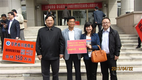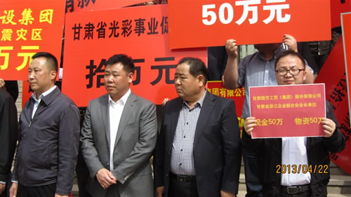 2013年4月22日下午15時,在甘肅省政協(xié)一樓,由甘肅省委常委、省委統(tǒng)戰(zhàn)部部長澤巴足,省委統(tǒng)戰(zhàn)部副部長、甘肅省工商聯(lián)黨組書記、第一副主席吳繼德等相關(guān)領(lǐng)導(dǎo)出席了“甘肅省商會非公經(jīng)濟人士向四川雅安災(zāi)區(qū)獻愛心捐贈儀式”。捐贈現(xiàn)場眾多甘肅省非公企業(yè)向4月20日雅安市地震災(zāi)區(qū)進行了捐贈,廣大愛心企業(yè)和人士用自己的實際行動對災(zāi)區(qū)同胞奉獻了自己的真情和祝福。